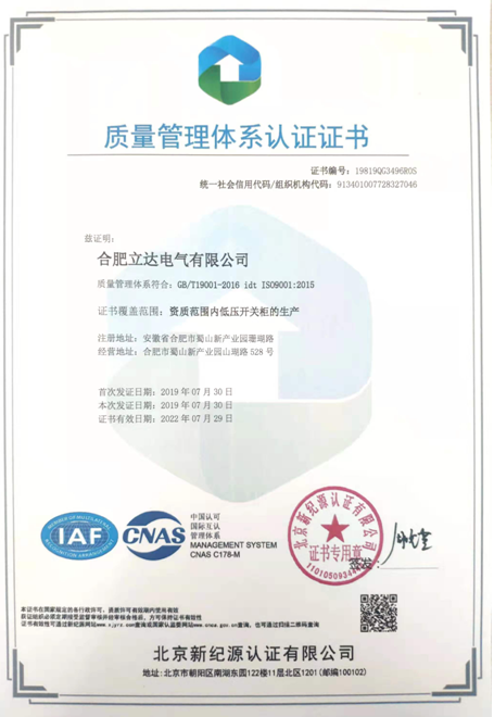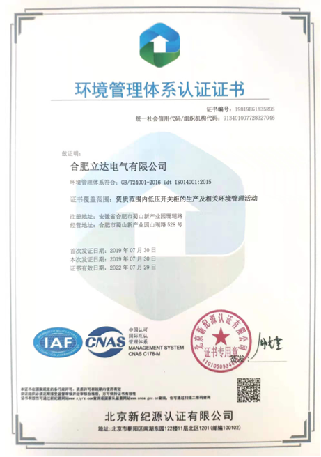 經過國家權威機構北京新紀源認證有限公司專家組的全面、嚴格、細致的指導和審核,確認合肥立達電氣有限公司環境管理體系符合GB/T 24001-2016 idt ISO14001:2015標準,質量管理體系符合GB/T19001-2016 idt ISO 9001:2015標準,并于2019年7月30日向我公司正式頒發了ISO9001質量管理體系認證與ISO14001環境管理體系認證兩大證書。 通過推行ISO9001質量和ISO14001環境管理體系,不但提高了公司的質量環境意識,更重要的是質量環境管理體系的建立和實施規范了公司的管理,為公司的發展壯大提供了堅實的基礎平臺,體現我公司的產品和服務質量達到了國際標準化的品質管理要求,標志著我公司管理在科學化、精細化、標準化方面又邁出了了重要的一步!